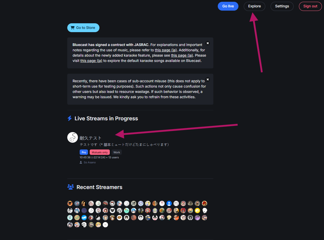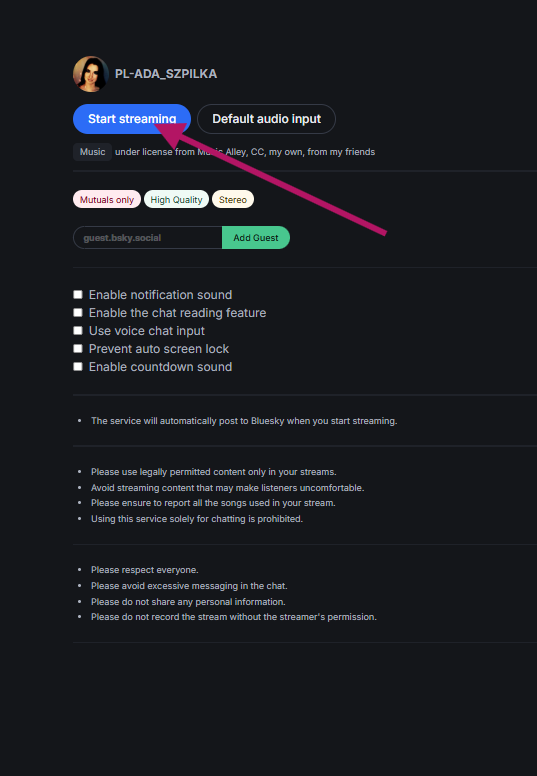 Kliknij „Start Streaming”, aby rozpocząć audycję. Zostanie to ogłoszone skeetem na Twoim Bluesky. Jeśli jesteś w trybie PRO i mimo rozpoczętej transmisji goście się nie pojawiają, sprawdź, czy „Tryb testowy” jest włączony.