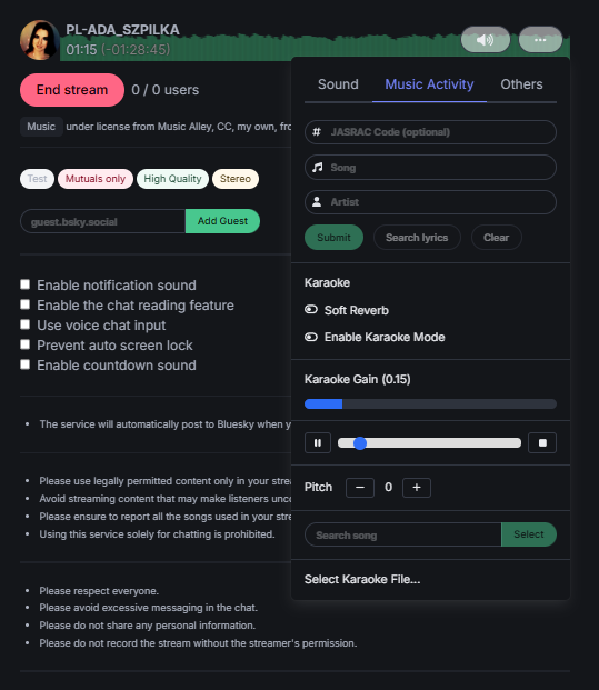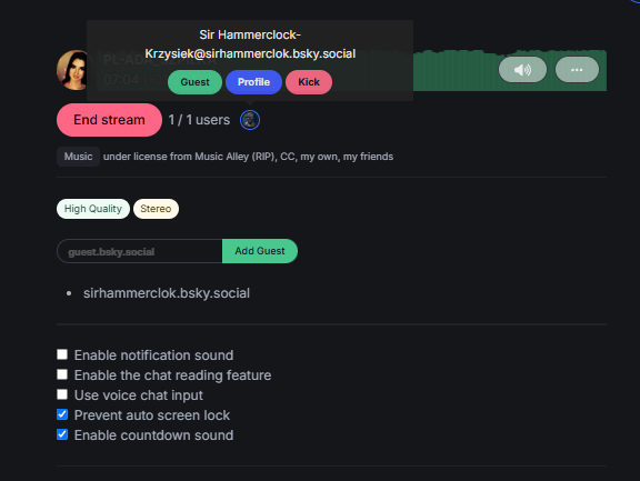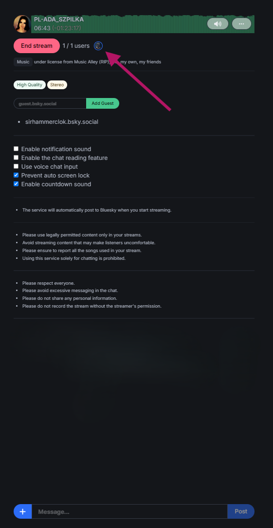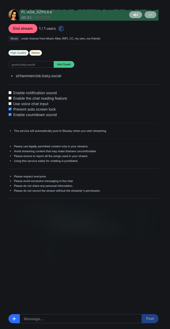 - Share this live stream - okno umożliwiające wysłanie skeeta o audycji (mozesz wpisać tam np. informację że za X minut będzie rozmowa z ważnym gościem