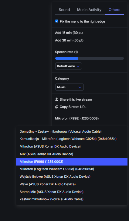 - Select Music File... - jesli masz plik dźwiękowy, do którego masz prawa autorskie, bądź licencję na jego wykorzystywanie- możesz go tu wskazać do odtwarzania z dysku lokalnego