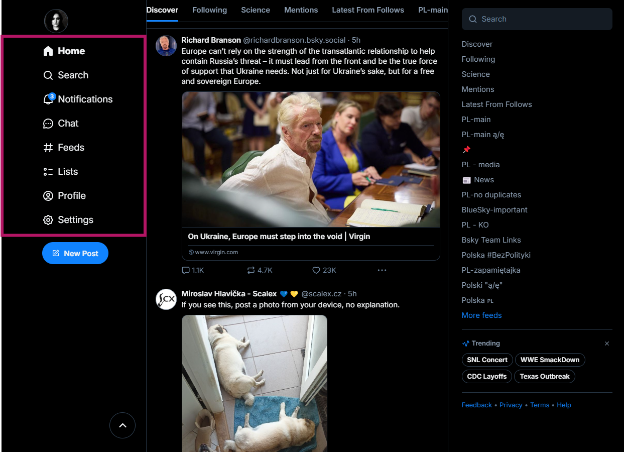 - Discover - służy do uczenia algorytmu tego, jakich treści oczekujesz od Bluesky