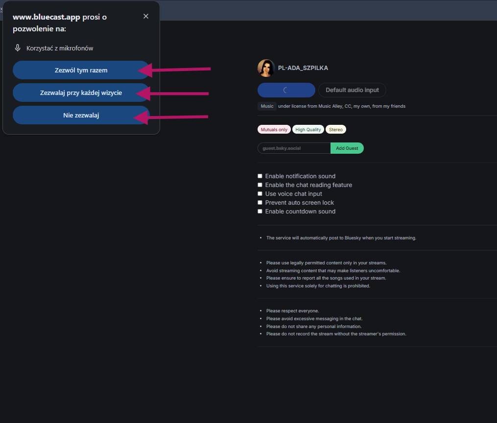 Po naciśnięciu przycisku „Start Streaming” pojawi się okno dialogowe z prośbą o pozwolenie na wejście mikrofonowe, kliknij jedną z opcji „Zezwalaj”.