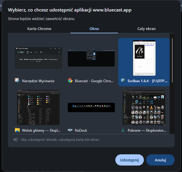 - Wybrane okno (np. prezentacja pakietu biurowego, arkusz kalkulacyjny pakietu biurowego, bądź okno folderu)