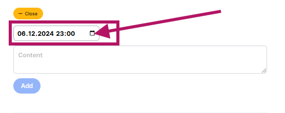 Pojawi się okienko do wpisów, jak na poniższym zdjęciu. Pierwsze dotyczy daty i godziny, a drugie z opisem "Content" służy do wpisania przez Ciebie informacji o nadchodzącej audycji. Gdy klikniesz na ikonkę kalendarza w okienku, możesz zaplanować wydarzenie.