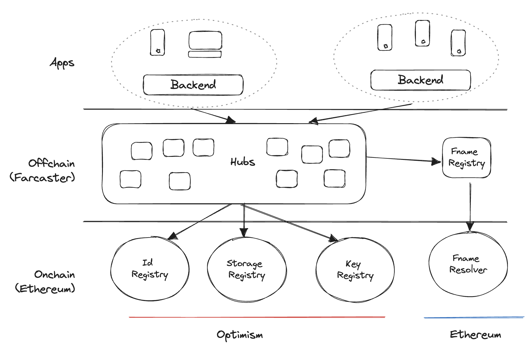 - Farcaster uses “Apps” to abstract away user interaction with the Hubs and with the smart contracts for account creation. Apps are formed of a traditional frontend and backend.