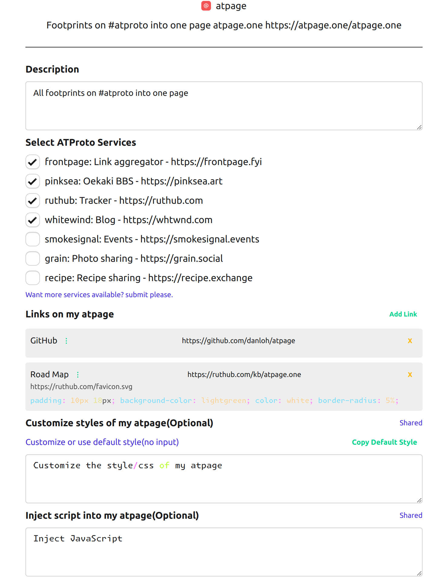 On setup page, just select some of your atproto services to generate the unified feed on your atpage OR add some links such as your social media links OR do the both. then your atpage is done!