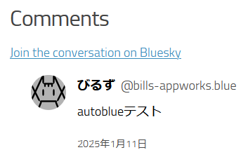 この状態でWordPress記事を公開すると、前掲のように"Comments"、"Join the conversation on Bluesky"リンク、リプライポストがブロックに対応する場所にインライン表示されます。Autoblueのサイトではライクも表示されるように記載されていますが、確認した範囲では表示されていないように思われます。