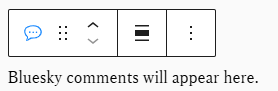 このブロックを配置すると記事中に”Bluesky comments will appear here.”という文字列表示のブロックになります。以下のスクリーンショットはGutenbergエディタでブロックにフォーカスして上側にポップアップメニューが表示されている状態です。