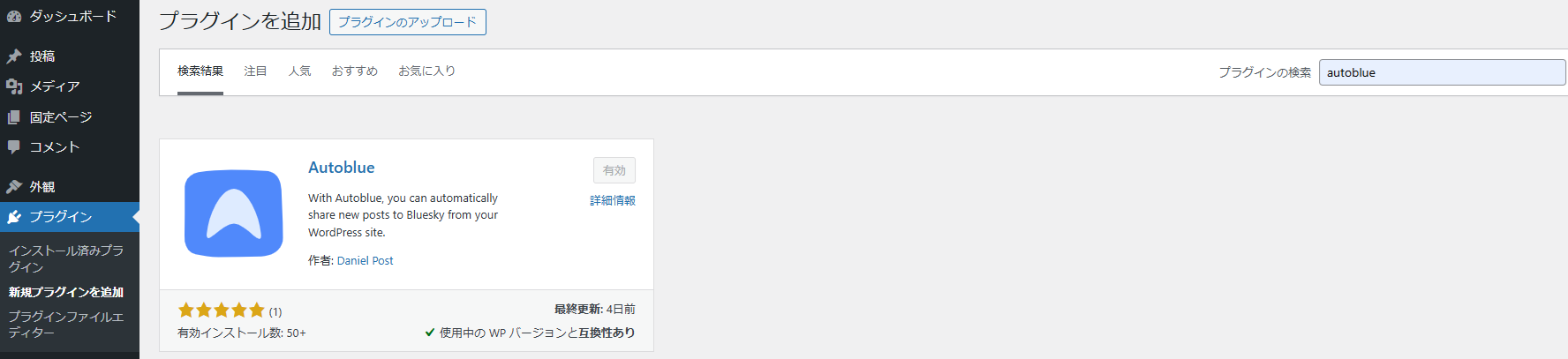 1.WordPressのプラグイン管理画面で"autoblue"を検索してインストール(誤って他のプラグインをインストールしないように注意)