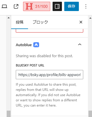 設定で自動ポストをONにすれば、おそらくWordPress記事公開時にWordPress記事へのリンクが紹介文(Autoblue公式サイトスクリーンショット参照)と共にBlueskyへポストされ、そのBlueskyポストのURLがWordPress記事プロパティに自動で設定されるものと思われます。