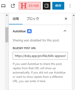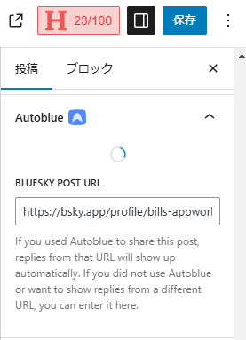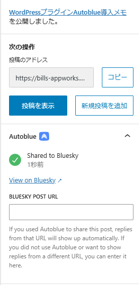 その下には"BLUESKY POST URL"という空の入力欄が表示されています。前記事で紹介しましたように、記事中にAutoblueカスタムブロックを配置するとシェアポストに対するリプライリアクションがブロックの位置に表示されますが、そのブロックに紐づけるBlueskyシェアポストのURLの入力欄となっています。これは自分の確認範囲では自動的に設定されないため、自分でBlueskyシェアポストのURLを指定して再度WordPress記事を更新する必要があるようです。現時点でのAutoblueの実装として、Bluesky自動シェアポストとカスタムブロックリアクション表示機能のためのBlueskyポスト連携設定は別物として扱われているようです。