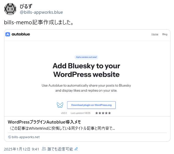 当記事ではAutoblueにて、WordPress記事公開時に連携Blueskyアカウントで記事をシェアする自動ポストを実行する機能を有効化した場合の状況について参考に記します。