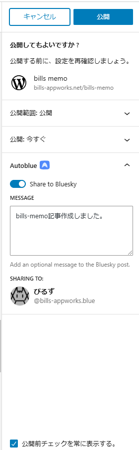 "Share to Bluesky"がONの状態でWordPress記事の公開アクションをすると、記事公開時の確認をONにしている場合は、以下のようにAutoblueプロパティの指定を含めて確認をすることができます。このケースではあらかじめ"MESSAGE"プロパティに「bills-memo記事作成しました。」という文字列を指定しています。