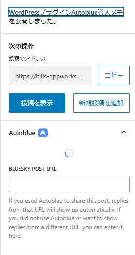 なお"BLUESKY POST URL"には誤ってWordPress記事自体のURLを指定しないよう注意しましょう。そのためか、最初から正しくBlueskyポストURLを指定した場合もかは確認していませんが、下記のようにWordPress記事プロパティのおそらく"Shared to Bluesky"欄が、その後もbusyアイコンのままとなってしまいました。ただし後述のようにプラグイン導入前の記事についても同様となりましたので因果関係は不明です。
