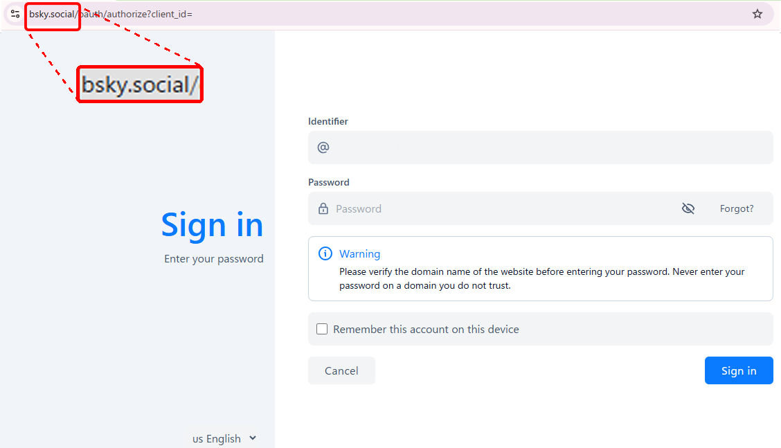 Example of an OAuth authentication screen (the domain in the address bar at the top is the official Bluesky bsky.social)