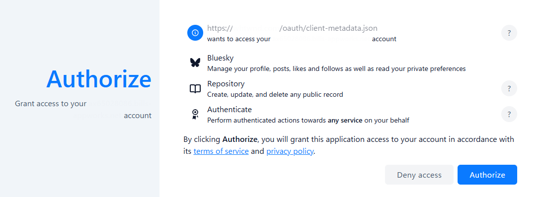 Regarding the displayed permissions, the options currently available from apps provided by Bluesky are broad, so they may not seem to match the app's functional scope. This is being continuously improved to allow for more granular permission scopes, so it is expected that the scope of permissions will be more limited in the future.