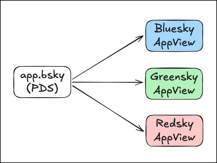 上図では「Bluesky」「Greensky」「Redsky」が同じデータを共有しています。そのため、例えば「Redsky」で投稿やフォローをすると、その結果は「Bluesky」や「Greensky」を使用しているユーザーにも反映されます。