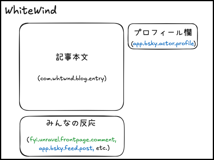このブログサービス『WhiteWind』では、右上のプロフィール欄の表示にBlueskyのレコード(app.bsky.actor.profile)を使用しています。また記事下部の「Reactions from everyone」セクションは、BlueskyやFrontpageといったAtmosphere上のサービスで記事が言及された場合に、そのレコードを表示する仕組みです。