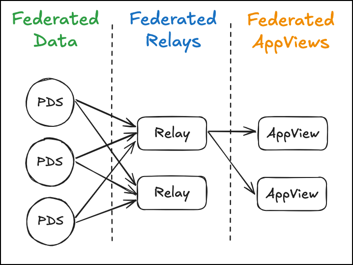AT Protocolでは、巨大プラットフォームを役割ごとに分割しました。その結果、ActivityPubとは異なり、エコシステム内に複数の連合関係を内包しています。