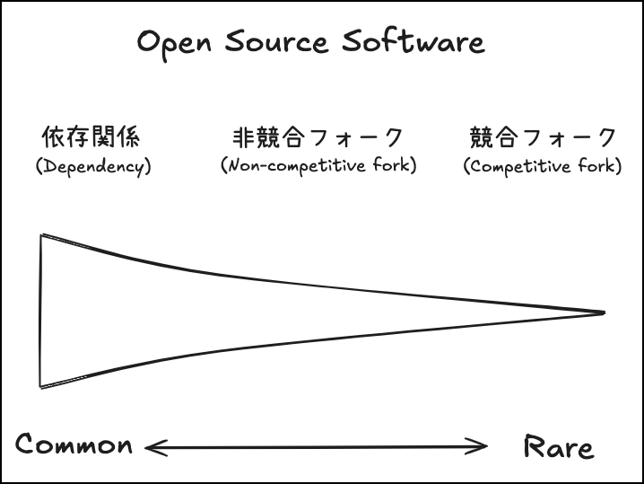 実際のオープンソース利用シーンでは、「依存関係」や「非競合フォーク」が圧倒的に主流です。競合フォークは、プロジェクトの将来像や方向性に関する根本的な対立が発生した場合などに、例外的に行なわれます。11