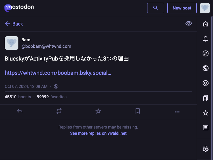 ActivityPubというプロトコル自体は、小規模なフェディバース(Small Fedi)で利用する限り決して悪いものではありません。あくまで大規模な環境での使用には適していないという話です。
