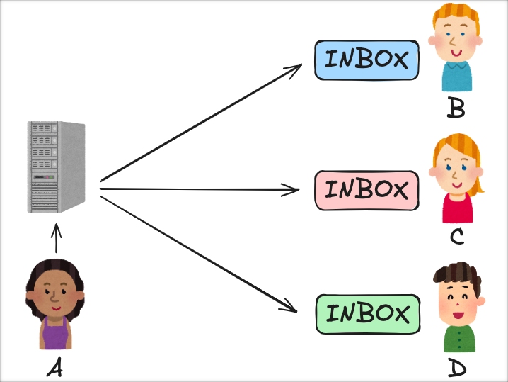 ユーザーAは、他のサーバーに所属するB, C, Dからフォローされています。Aが投稿すると、その投稿はB, C, DのInboxに送信(POST)されます。B, C, Dは自分のInboxを確認(GET)してAの投稿を閲覧できます。