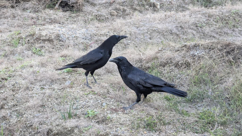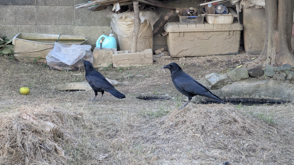(I haven't figured out how to add an Alt Text in the pic, so here it is: Mr. and Ms. Crow in a garden in the neighborhood, on Sunday afternoon. The garden is not used anymore and I think the land is for sale. Which is sad, the chances that it'll be replaced by a house are close to 100%. On less area with nature and plants in the neighborhood (Japanese people hate nature and are in love with concrete, I swear)