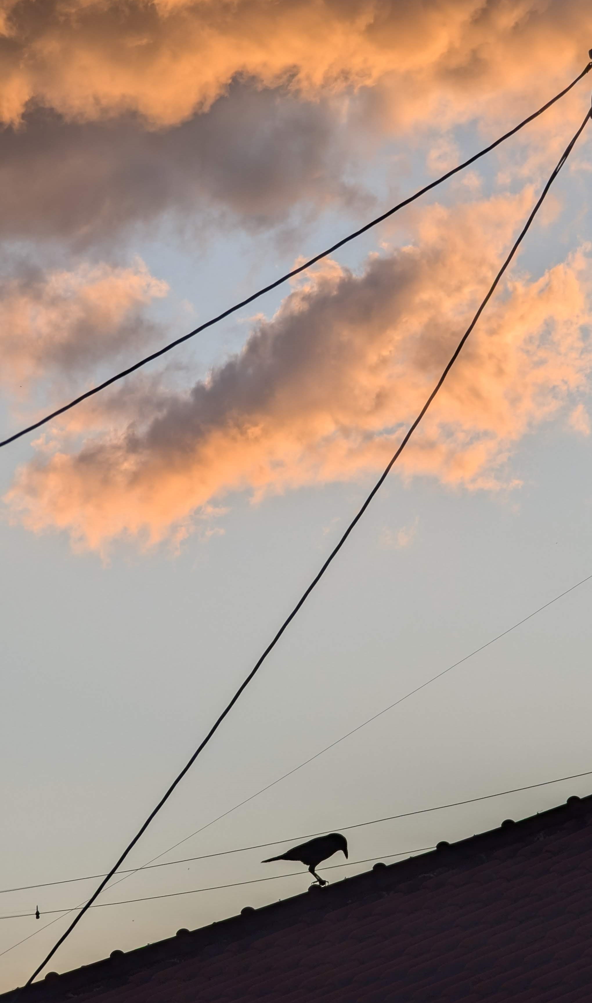 Alt Text: Ms. Crow eating something on the neighbor's roof above her, some stunning orange clouds lit by the setting sun.