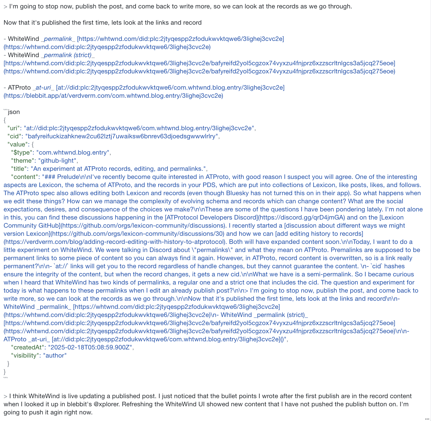 "content": "### Prelude\n\nI've recently become quite interested in ATProto, with good reason I suspect you will agree. One of the interesting aspects are Lexicon, the schema of ATProto, and the records in your PDS, which are put into collections of Lexicon, like posts, likes, and follows. The ATProto spec also allows editing both Lexicon and records (even though Bluesky has not turned this on in their app). So what happens when we edit these things? How can we manage the complexity of evolving schema and records which can change content? What are the social expectations, desires, and consequence of the choices we make?\n\nThese are some of the questions I have been pondering lately. I'm not alone in this, you can find these discussions happening in the [ATProtocol Developers Discord](https://discord.gg/qrD4jmGA) and on the [Lexicon Community GitHub](https://github.com/orgs/lexicon-community/discussions). I recently started a [discussion about different ways we might version Lexicon](https://github.com/orgs/lexicon-community/discussions/30) and how we can [add editing history to records](https://verdverm.com/blog/adding-record-editing-with-history-to-atprotocol). Both will have expanded content soon.\n\nToday, I want to do a little experiment on WhiteWind. We were talking in Discord about \"permalinks\" and what they mean on ATProto. Premalinks are supposed to be permanent links to some piece of content so you can always find it again. However, in ATProto, record content is overwritten, so is a link really permanent?\n\n- `at://` links will get you to the record regardless of handle changes, but they cannot guarantee the content. \n- `cid` hashes ensure the integrity of the content, but when the record changes, it gets a new cid.\n\nWhat we have is a semi-permalink. So I became curious when I heard that WhiteWind has two kinds of permalinks, a regular one and a strict one that includes the cid. The question and experiment for today is what happens to these permalinks when I edit an already publish post?\n\n> I'm going to stop now, publish the post, and come back to write more, so we can look at the records as we go through.\n\nNow that it's published the first time, lets look at the links and record\n\n- WhiteWind _permalink_ [https://whtwnd.com/did:plc:2jtyqespp2zfodukwvktqwe6/3lighej3cvc2e](https://whtwnd.com/did:plc:2jtyqespp2zfodukwvktqwe6/3lighej3cvc2e)\n- WhiteWind _permalink (strict)_ [https://whtwnd.com/did:plc:2jtyqespp2zfodukwvktqwe6/3lighej3cvc2e/bafyreifd2yol5cgzox74vyxzu4fnjprz6xzzscrltnlgcs3a5jcq275eoe](https://whtwnd.com/did:plc:2jtyqespp2zfodukwvktqwe6/3lighej3cvc2e/bafyreifd2yol5cgzox74vyxzu4fnjprz6xzzscrltnlgcs3a5jcq275eoe)\n\n- ATProto _at-uri_ [at://did:plc:2jtyqespp2zfodukwvktqwe6/com.whtwnd.blog.entry/3lighej3cvc2e](https://blebbit.app/at/verdverm.com/com.whtwnd.blog.entry/3lighej3cvc2e)\n\n```json\n{\n \"uri\": \"at://did:plc:2jtyqespp2zfodukwvktqwe6/com.whtwnd.blog.entry/3lighej3cvc2e\",\n \"cid\": \"bafyreifuckizahknew2cu62lztj7uwaiksw6bnrev63djoedsgwwwlrlry\",\n \"value\": {\n \"$type\": \"com.whtwnd.blog.entry\",\n \"theme\": \"github-light\",\n \"title\": \"An experiment at ATProto records, editing, and permalinks.\",\n \"content\": \"### Prelude\\n\\nI've recently become quite interested in ATProto, with good reason I suspect you will agree. One of the interesting aspects are Lexicon, the schema of ATProto, and the records in your PDS, which are put into collections of Lexicon, like posts, likes, and follows. The ATProto spec also allows editing both Lexicon and records (even though Bluesky has not turned this on in their app). So what happens when we edit these things? How can we manage the complexity of evolving schema and records which can change content? What are the social expectations, desires, and consequence of the choices we make?\\n\\nThese are some of the questions I have been pondering lately. I'm not alone in this, you can find these discussions happening in the [ATProtocol Developers Discord](https://discord.gg/qrD4jmGA) and on the [Lexicon Community GitHub](https://github.com/orgs/lexicon-community/discussions). I recently started a [discussion about different ways we might version Lexicon](https://github.com/orgs/lexicon-community/discussions/30) and how we can [add editing history to records](https://verdverm.com/blog/adding-record-editing-with-history-to-atprotocol). Both will have expanded content soon.\\n\\nToday, I want to do a little experiment on WhiteWind. We were talking in Discord about \\\"permalinks\\\" and what they mean on ATProto. Premalinks are supposed to be permanent links to some piece of content so you can always find it again. However, in ATProto, record content is overwritten, so is a link really permanent?\\n\\n- `at://` links will get you to the record regardless of handle changes, but they cannot guarantee the content. \\n- `cid` hashes ensure the integrity of the content, but when the record changes, it gets a new cid.\\n\\nWhat we have is a semi-permalink. So I became curious when I heard that WhiteWind has two kinds of permalinks, a regular one and a strict one that includes the cid. The question and experiment for today is what happens to these permalinks when I edit an already publish post?\\n\\n> I'm going to stop now, publish the post, and come back to write more, so we can look at the records as we go through.\\n\\nNow that it's published the first time, lets look at the links and record\\n\\n- WhiteWind _permalink_ [https://whtwnd.com/did:plc:2jtyqespp2zfodukwvktqwe6/3lighej3cvc2e](https://whtwnd.com/did:plc:2jtyqespp2zfodukwvktqwe6/3lighej3cvc2e)\\n- WhiteWind _permalink (strict)_ [https://whtwnd.com/did:plc:2jtyqespp2zfodukwvktqwe6/3lighej3cvc2e/bafyreifd2yol5cgzox74vyxzu4fnjprz6xzzscrltnlgcs3a5jcq275eoe](https://whtwnd.com/did:plc:2jtyqespp2zfodukwvktqwe6/3lighej3cvc2e/bafyreifd2yol5cgzox74vyxzu4fnjprz6xzzscrltnlgcs3a5jcq275eoe)\\n\\n- ATProto _at-uri_ [at://did:plc:2jtyqespp2zfodukwvktqwe6/com.whtwnd.blog.