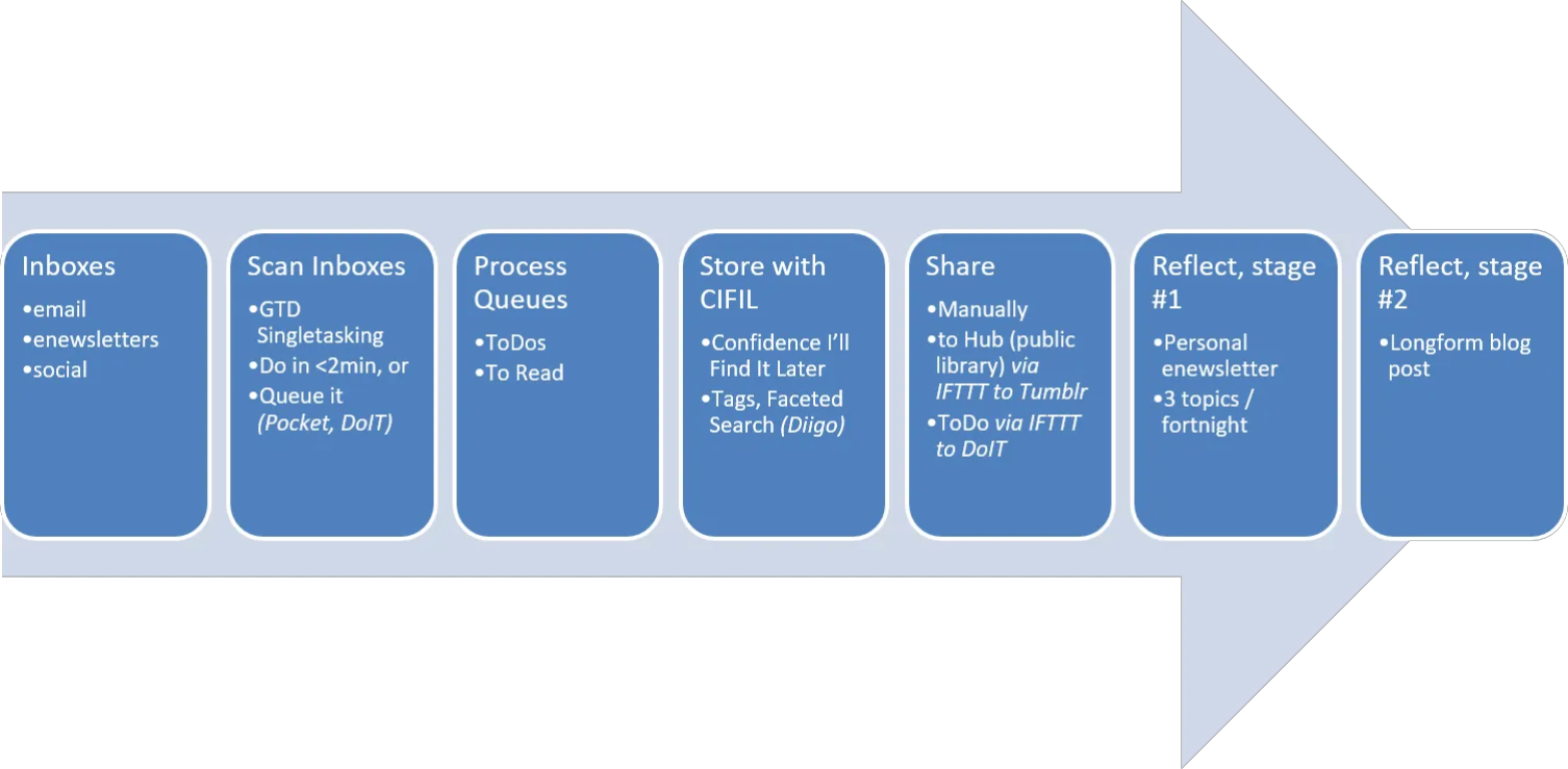 My thinking evolves in iterative steps from left to right. The leftmost steps are integral to my personal productivity process, and ensure I focus most of my time on the most valuable knowledge resources. Then I: