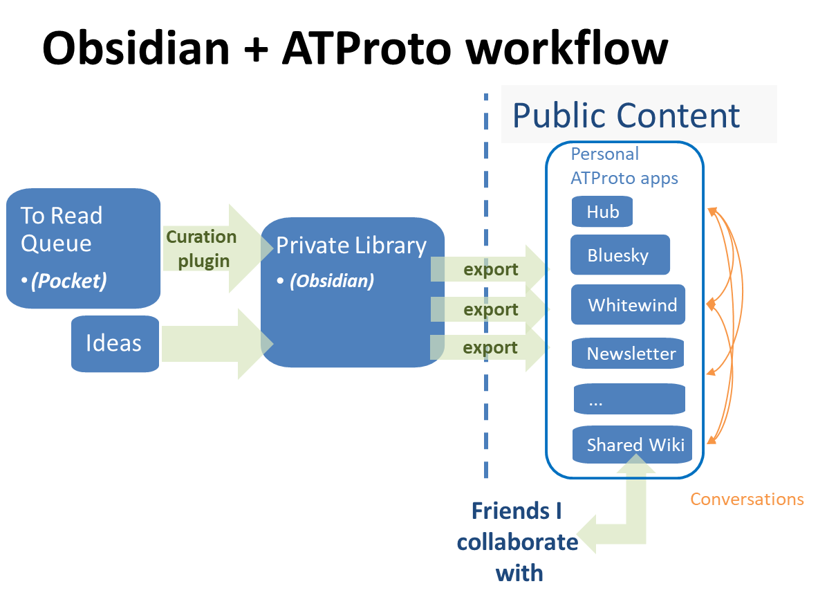 Everything goes into my private Obsidian library, where I think and write as before. However, by changing an Obsidian note's properties ("Hub this", "Blog this", etc.) it is exported to and published via the appropriate ATmosphere app, with social conversations on all of this content mediated via Bluesky.