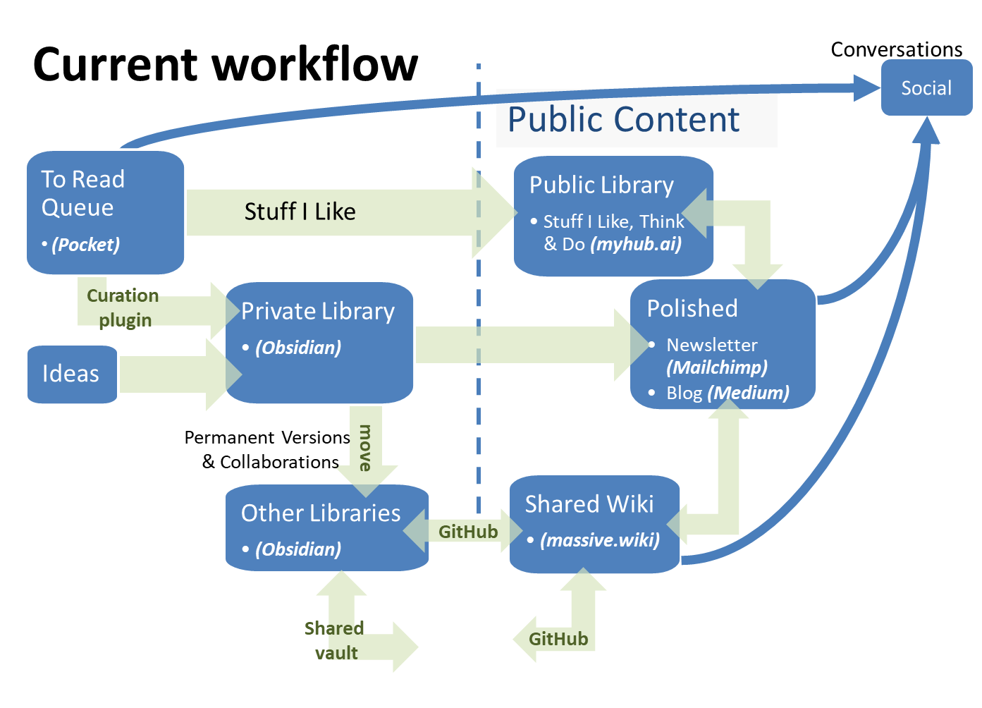 I use Pocket as my primary Reading Queue, but when I read something I like, I either write and share my notes publicly via my Public Library (on myhub.ai), or use Obsidian's Web clipper pluginto put my notes in my Private library - an Obsidian vault where I put my ideas and other fleeting notes, mix them together to draft blog posts and newsletters, which I then paste into Mailchimp and Medium.