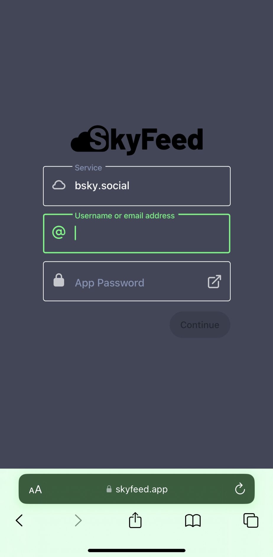 Faça login no SkyFeed com o seu username e a senha que você criou.