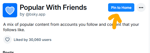 Los feed personalizados se puede añadir y fijar en el encabezado de tu aplicación de bluesky y aparecer como una columna nueva. Lo único que tienes que hacer es entrar al feed que te interesa y darle clic al botón que dice fijar en inicio (pin to home), como se muestra en la siguiente imagen: