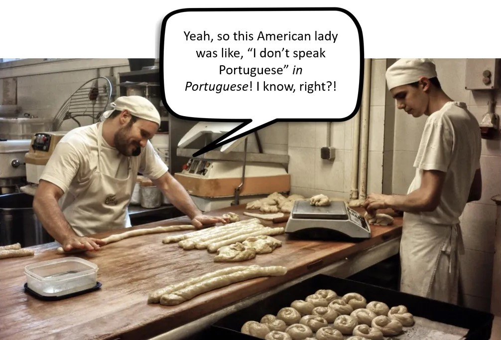 Me, in a bakery, to the man behind the counter: Eu falo um pouco de Português. Fala Inglês? I speak a little Portuguese. Do you speak English?
