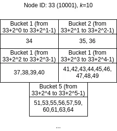Now let’s look at how queries work in Kademlia. Each peer maintains a list of contact information for other nodes, typically IP address, UDP port, Node ID (as Kademlia messages are passed using UDP). Further, this list is divided into several sublists known as k-buckets. The i-th k-bucket stores k nodes with IDs between 2^i and 2^{i+1} from itself. This can be visualized as follows: