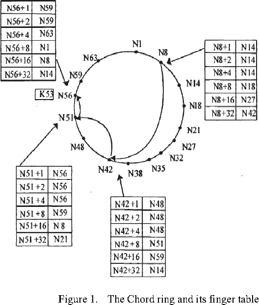 This addressing scheme is used in the DHT for finding content. A basic read occurs when a peer receives a query for a key, it passes the query on to the next peer (in the address circle) unless it contains the key in its datastore. However, this takes O(n) time which is quite costly in large networks. There is a faster solution that involves each peer maintaining a “Finger Table”. This table contains up to m ordered entries. To see this in action, if the node with ID N8 receives a query for key with ID K53, it will refer to its finger table for the node with the closest ID to 53 that it is aware of. From the diagram, we can see that this is N42. Thus, N8 will forward the request to N42. This node will see that N51 is the closest ID it is aware of less than 53. Finally, N51 will forward the request to N56 which will return the value for K53 (as there is no node closer to 53 counting upwards than N56). More generally, the finger table entry at row i will contain the peer with the address closest to the next power of 2 offset by the distance between the current peer and the peer with address 0. This can be represented in fancy notation (with n being the current peer’s address) as: