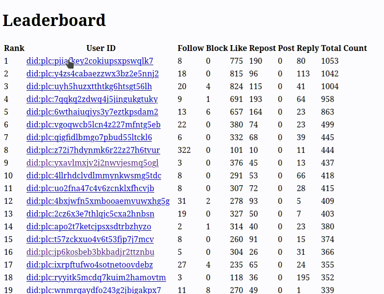Our first deployment was to Fly.io's free tier. Within a week, it became obvious that SQLite would not suffice for this task. I had some experience with PostgreSQL and the TimescaleDB extension, so it was the obvious choice. Fast forward a month, and we had the top 100 for the whole of Bluesky. The way we collected data allowed us to show analytics for any account on Bluesky. It was like having a backstage pass to the concert of data.