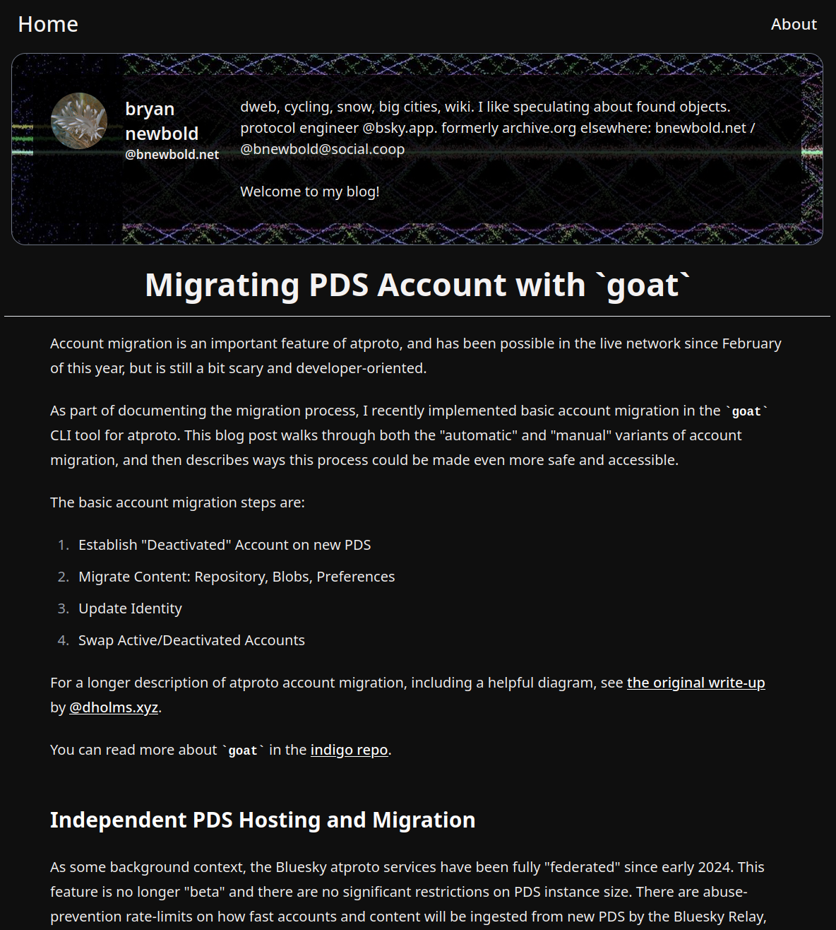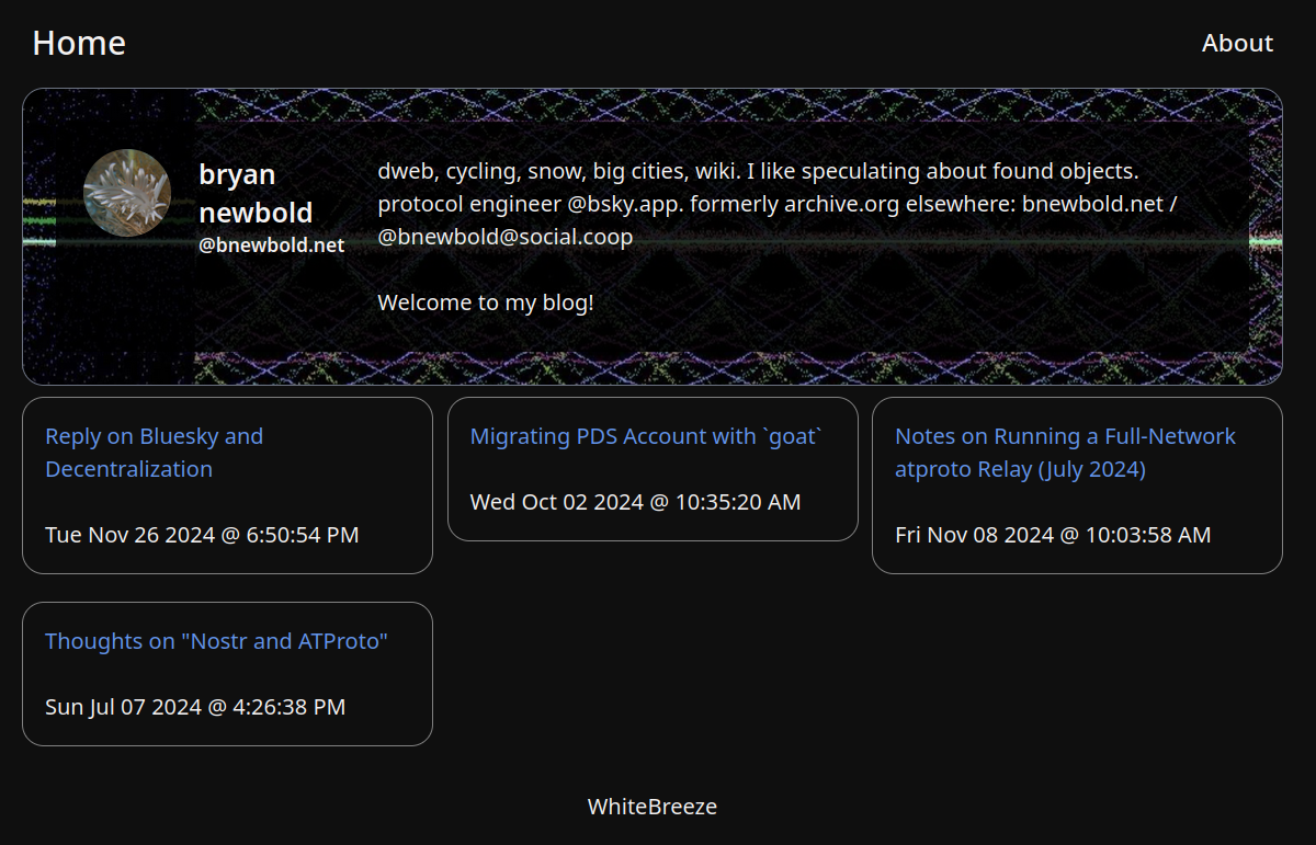So I've been a pretty heavy BlueSky user for a while, and recently went as far as to delete my Twitter. I found an interest/appreciation for ATproto after a bit of a frustrating time wrapping my head around it. Particularly, I've been interested in other applications of ATproto, besides the BlueSky short form text approach. I've seen a couple novel uses, picosky, pinksea, but the one that has caught my interest the most has been WhiteWind. The reason I think it's interesting is, when done right, all it really is is a middle man between your blog posts on a PDS, and your eyes.