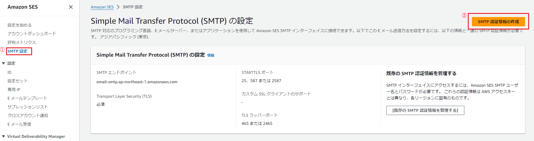 SES上の左ペインより[SMTP設定]を選択し、表示された画面にて[SMTP認証情報の作成]を選択します。