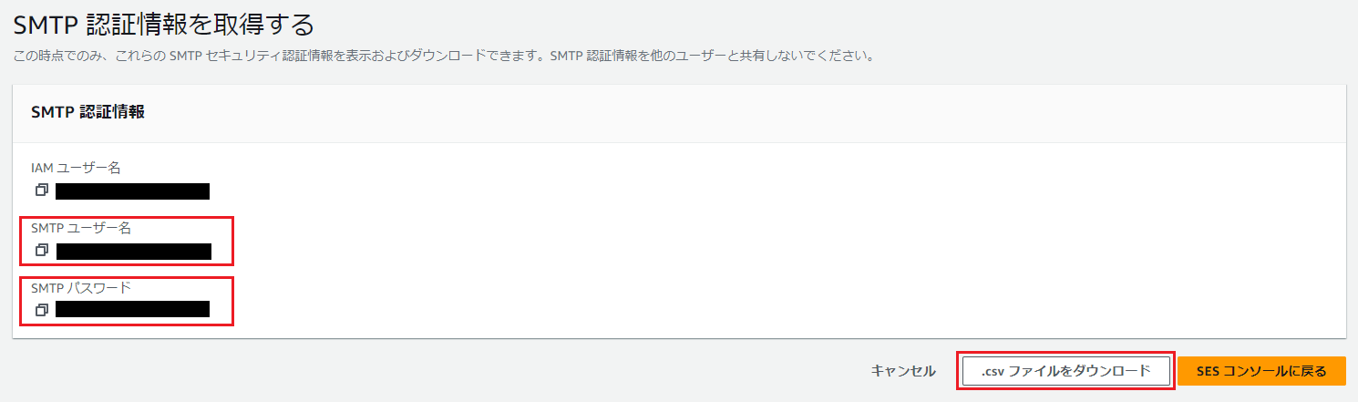 IAMリソースが作成され、SMTPユーザ情報とSMTPパスワードが表示されるので、csvダウンロードなりで情報を控えます。 ※SMTPパスワードは作成時のみ取得可能です。紛失するとユーザ作り直しになるのでご注意下さい。