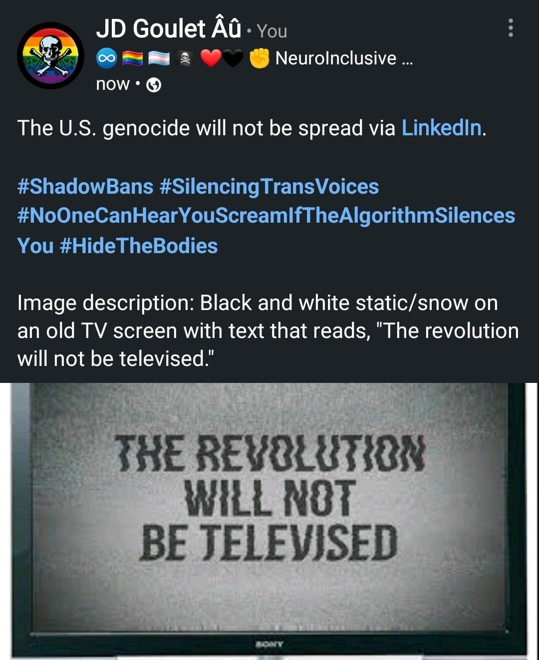 - As laws targeting transgender people were ramping up in the U.S., many trans professionals began to speak out about what this was doing to the wellbeing of trans employees and employees with trans kids. And more and more of us started to notice that our posts about this were being suppressed by the algorithm, something I would later come to learn has a term: shadowbanning. I could post about something uncontroversial and get 50 reactions, but if I posted anything that used the word “trans” in it I’d get one or two reactions. This prompted a post from me 3 days before I was permanently banned from the platform: