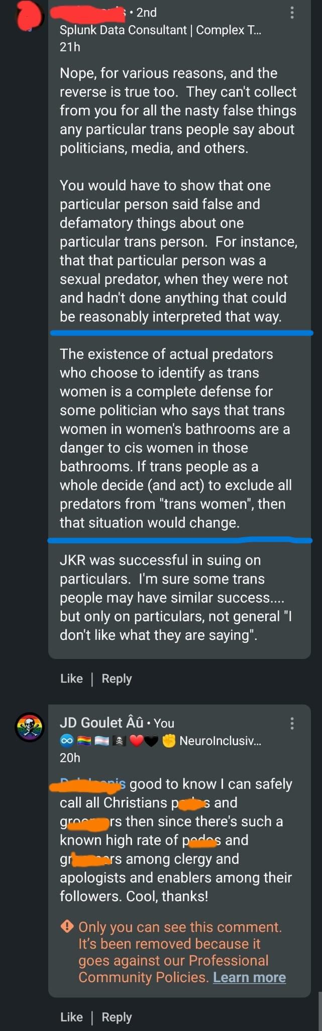 This still shocks me to this day. LinkedIn determined it was perfectly okay for this man to claim that all trans people are responsible for excluding predators who “choose to identify” as trans if they want to be treated with dignity and fairness, but when I point out the absurdity of that statement by comparing it to treating all Christians like second-class citizens and criminals because so many actual clergy members have been repeatedly caught sexually abusing children, I’m the one who gets my comment removed?!?! It’s absurd!!!