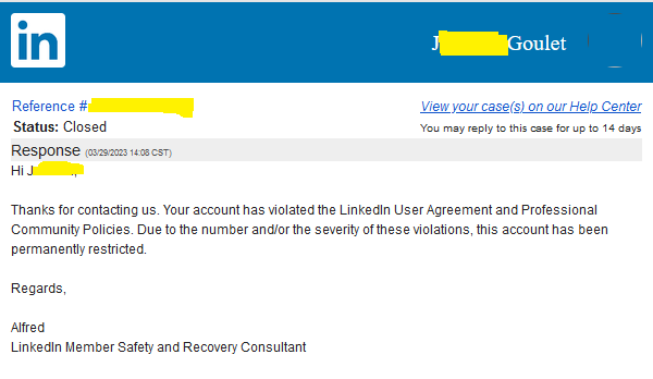 I have spent many sleepless nights speculating about what thing or combination of things I could have done that warranted my being permanently banned from LinkedIn, but in the end, I have no way of knowing. And that is quite possibly the most troubling part about the whole thing. (But, as you will see, I do have my suspicions.) After going through the process of uploading my ID and appealing the decision, the final word came from Alfred, who would only say that my account was permanently restricted “Due to the number and/or the severity of these violations.” What violations? I don’t know.