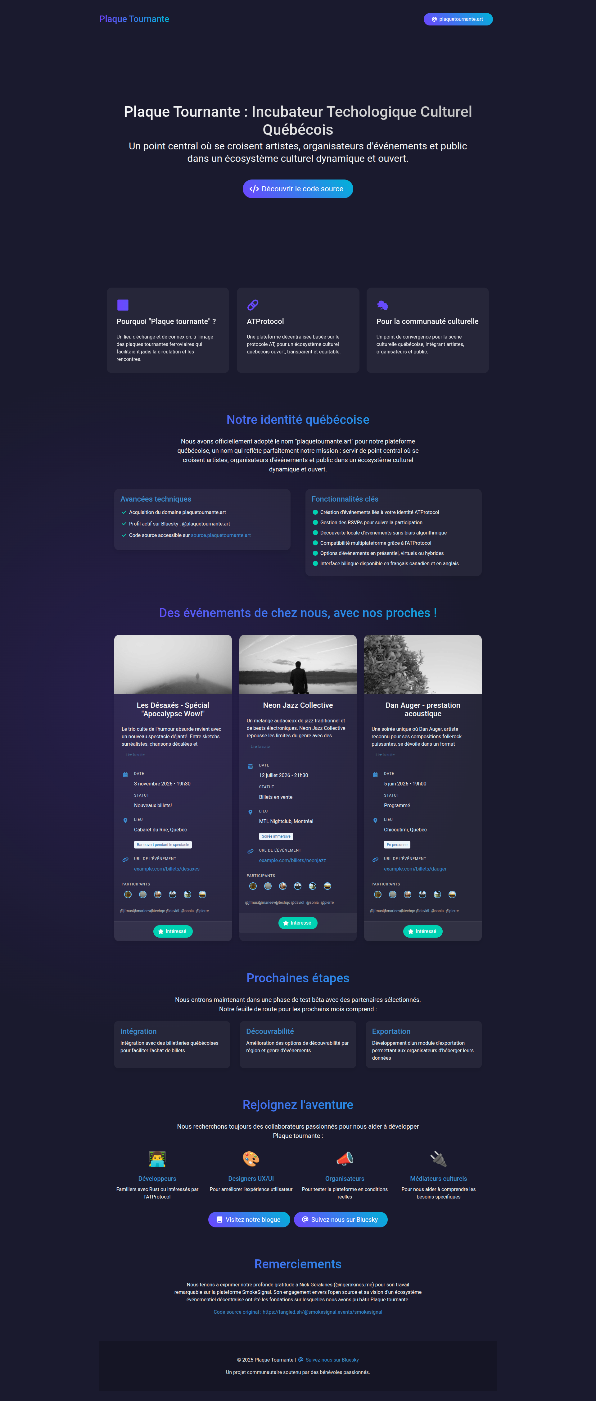 Nous tenons à exprimer notre profonde gratitude à Nick Gerakines (@ngerakines.me) pour son travail remarquable sur la plateforme SmokeSignal. Son engagement envers l'open source et sa vision d'un écosystème événementiel décentralisé ont été les fondations sur lesquelles nous avons pu bâtir Plaque tournante. Sans sa générosité à partager son code et sa connaissance, notre adaptation québécoise n'aurait pas été possible. Nick incarne parfaitement l'esprit collaboratif qui fait la force des communautés open source, et nous sommes honorés de poursuivre cette tradition avec notre contribution locale.