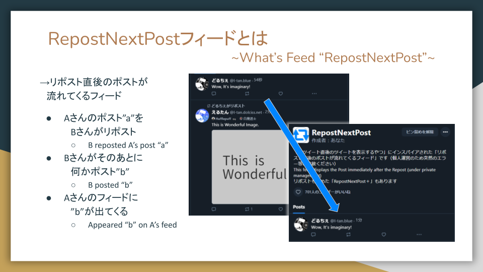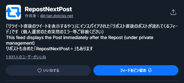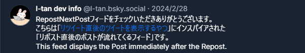 この内容でご存じの方はピンとくるかと思いますが、Twitter時代にあった「リツイート直後のツイートを表示するやつ」にインスパイアされ、カスタムフィードとして作ったものです。作った経緯などについては以前アドベントカレンダー向けに記事を書きましたので、そちらを参照ください。 →SNS「Bluesky」のカスタムフィードがいろいろできるので「リツイート直後のツイートを表示するやつ」をつくった話