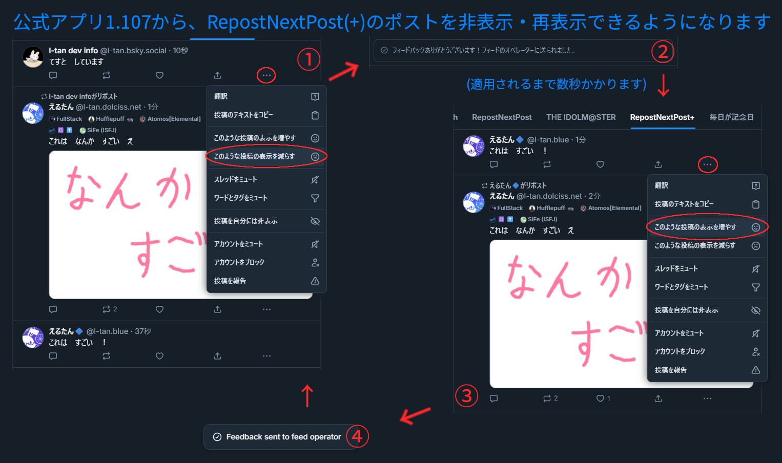 Bluesky公式アプリのVer.1.107から、機能を有効にしたカスタムフィードであれば、表示内容を変化させるメニューが出るようになりました。RepostNextPost(+)もこちらの機能に対応しており、メニューから投稿を非表示にすることができます。