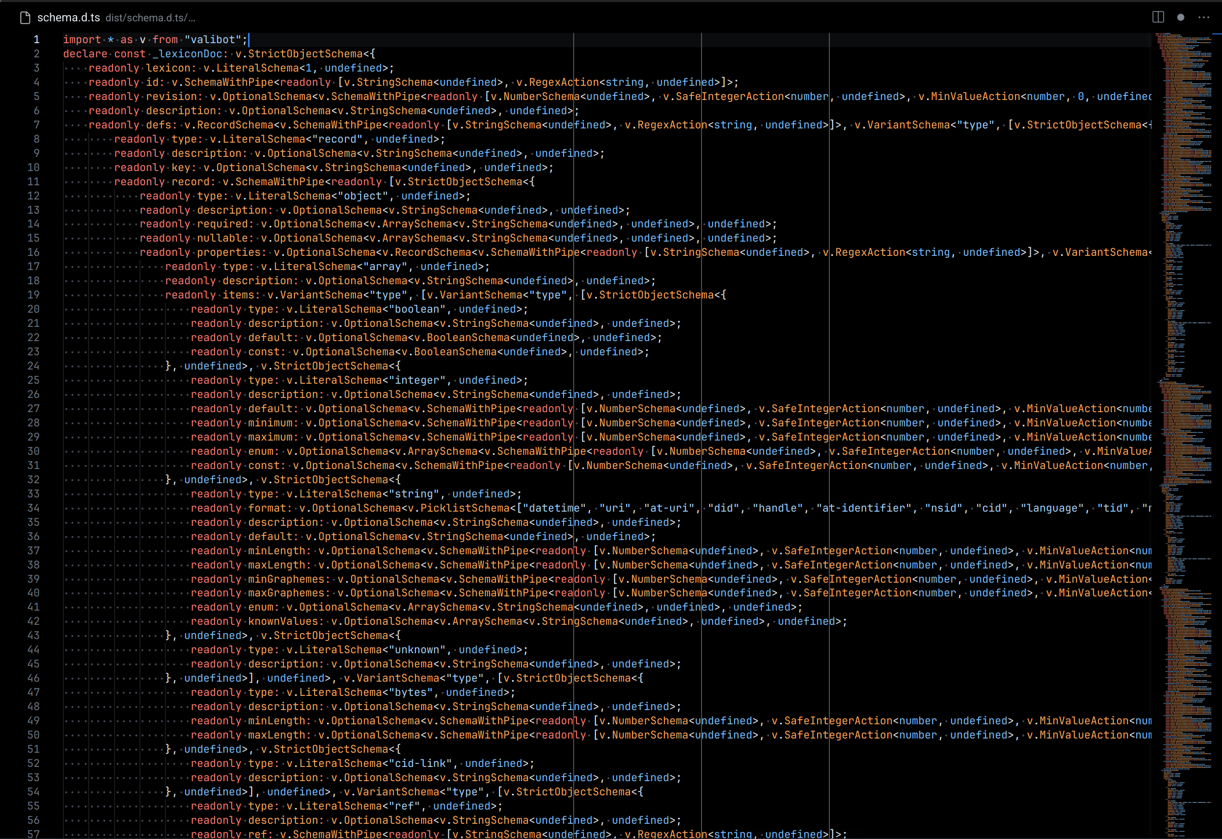 this schema defines AT Protocol's lexicon documents, but due to inlining, this one single exported schema is 2,943 lines long—approximately 146,870 characters (with most whitespaces removed), insane because this doesn't even cover the schemas it depends on which I also export. I find this to be a massive problem because the resulting declaration files becomes bloated and it's hard to read and see what's going on, big deal for a library!