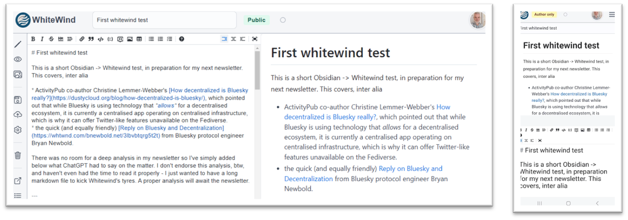 Whitewind's desktop editing environment, left, will be familiar to anyone who's ever used hackmd.io, while the mobile interface seems fully featured.