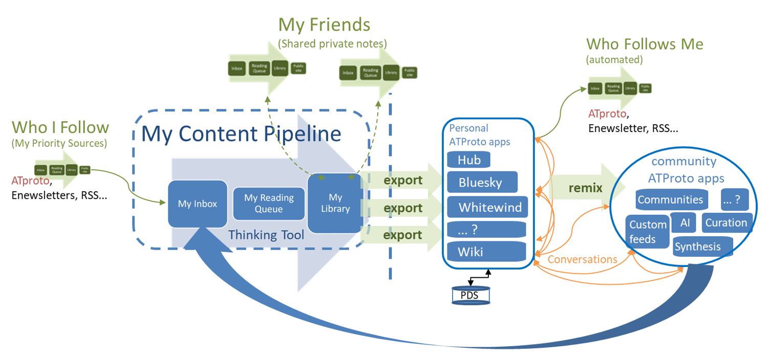 - (Personal ATProto apps, centre right): that the user can publish selected notes from the thinking tool directly to a variety of ATmosphere apps, and how conversations about that content can spread across multiple apps (eg Bluesky conversations about a Whitewind blogpost)