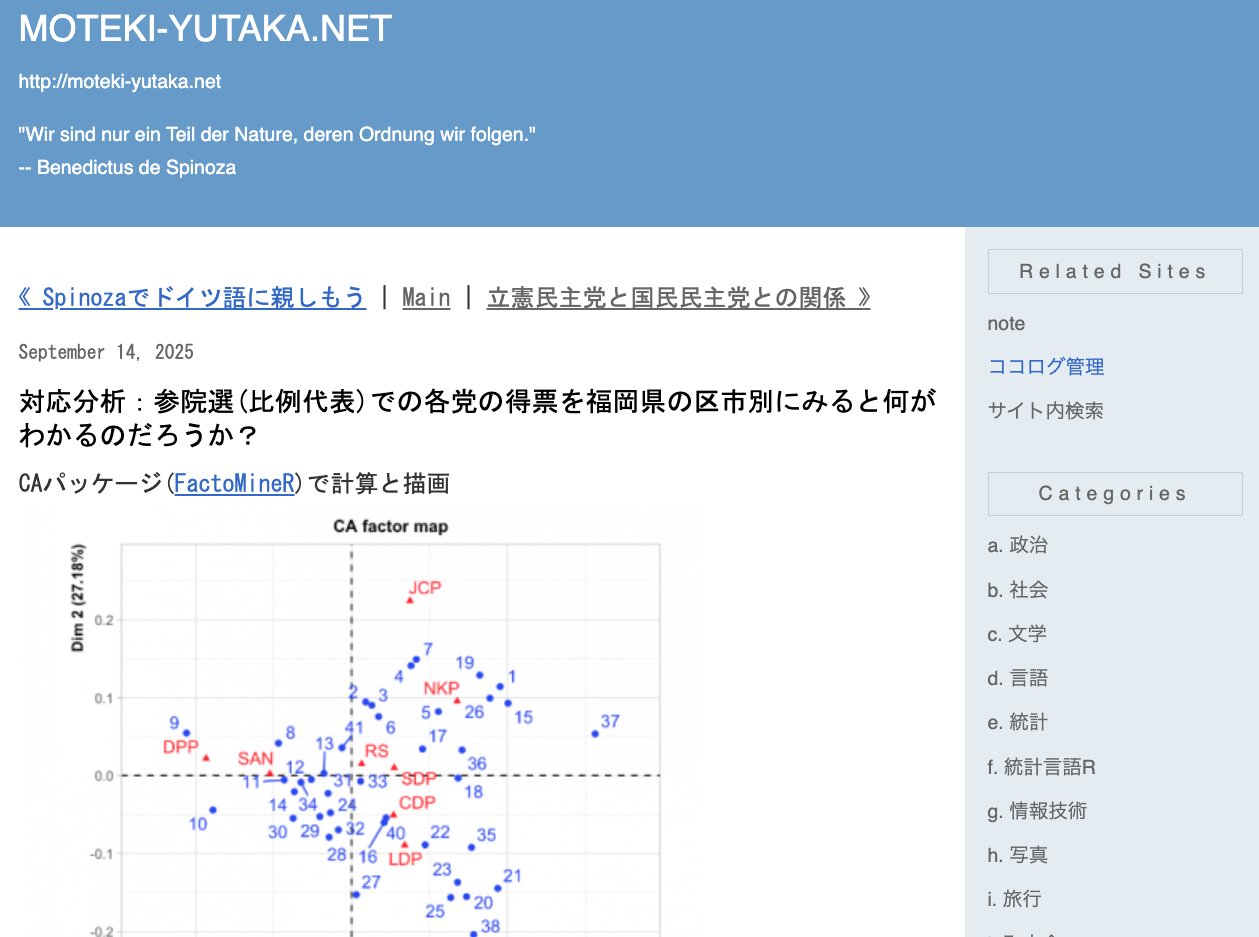 RStudioをつかってしばらくの間熱心に取り組んでいた「対応分析」はこの記事が最初のようだ。 福岡県選挙管理委員会が公表しているデータだけでどのようなことを明らかにすることができるかが探究の方針であった。探索的なものであり、回帰方程式などで人口学的データとの相関関係を証明しようとする意図はなかった。